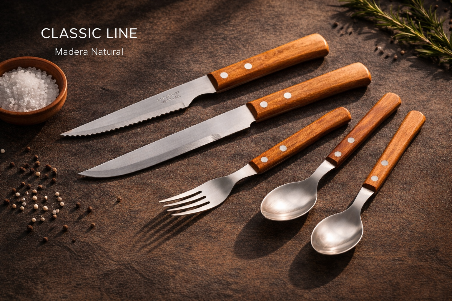 La colección Classic Line de Cuperinox combina mango de madera natural y acero inoxidable para ofrecer una cubertería resistente, equilibrada y con carácter tradicional.