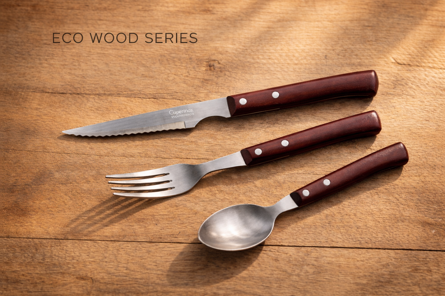 La colección EcoWood Series de Cuperinox combina mango efecto madera y acero inoxidable para ofrecer una cubertería resistente, equilibrada y con estética natural.