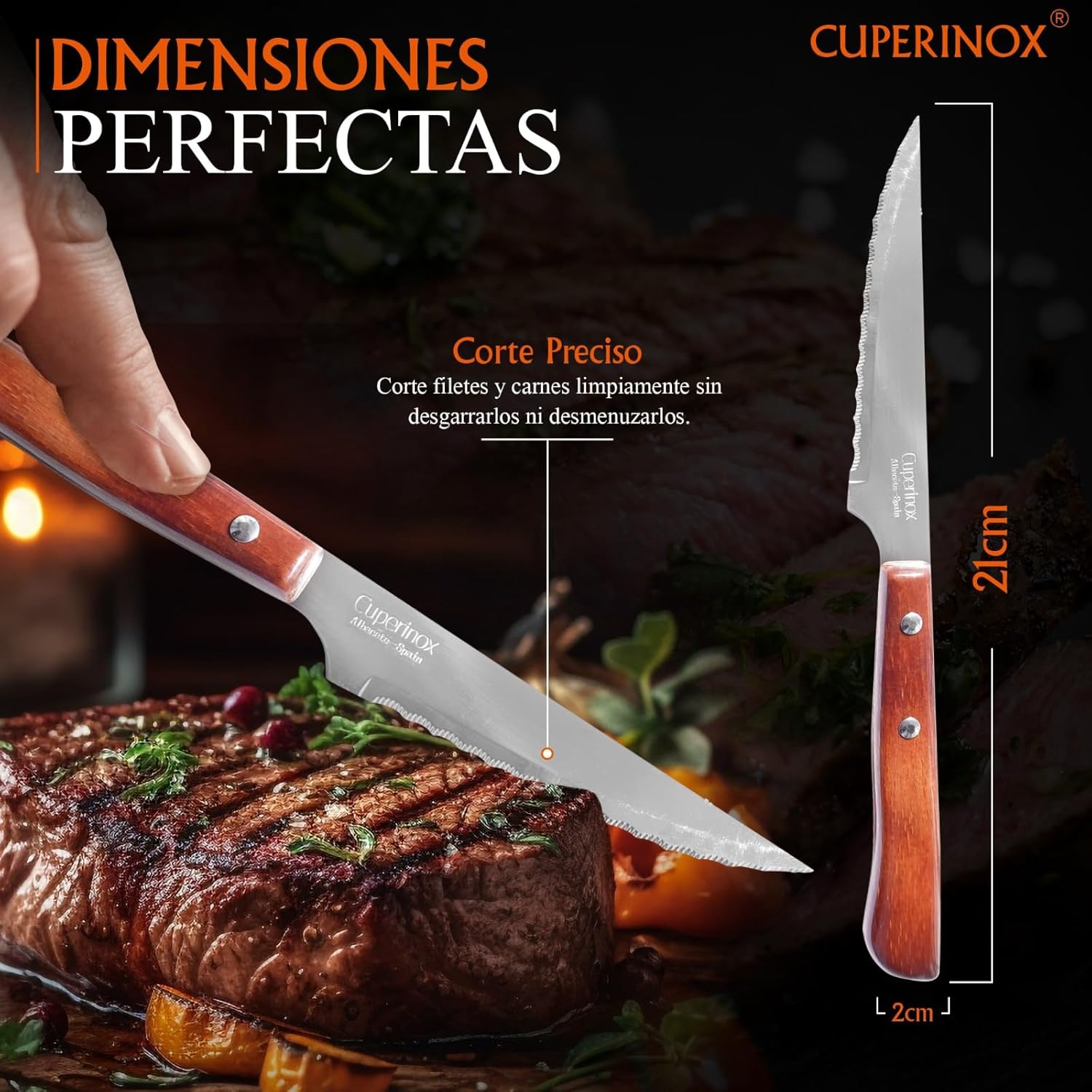 El acabado en madera aporta calidez visual y un carácter más clásico, perfecto para mesas de estilo rústico, natural o tradicional. Son cuchillos versátiles, diseñados para acompañarte tanto en el uso diario como en comidas especiales.