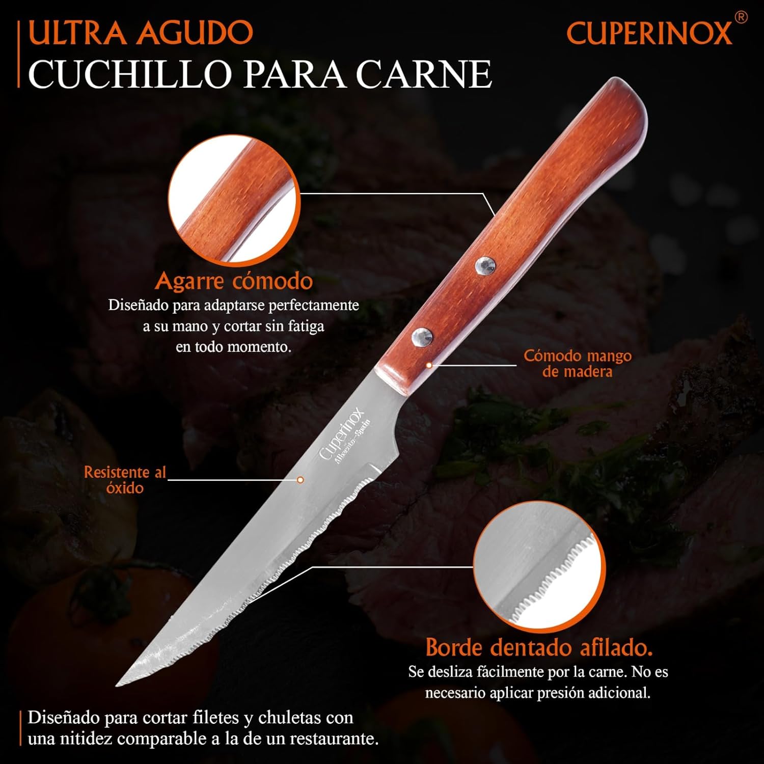 Aporta un toque cálido y tradicional a tu mesa con este set de 6 cuchillos de mesa con mango de madera natural. Su filo dentado facilita el corte de carne y otros alimentos en el día a día, combinando funcionalidad, comodidad y una estética clásica.