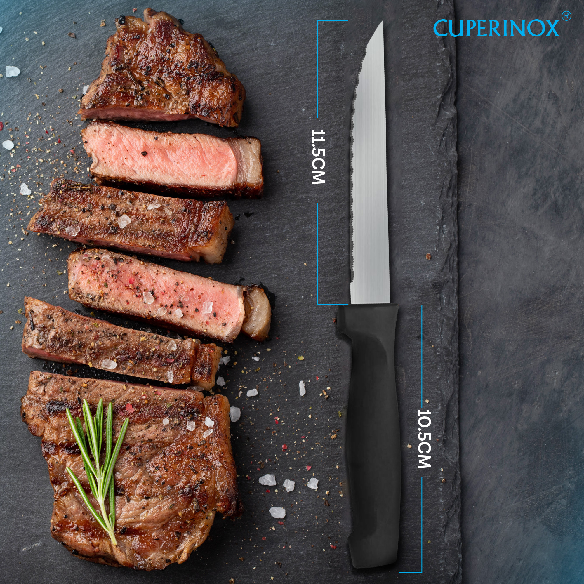 CUPERINOX® Cuchillos de Mesa Acero Inoxidable – Set Profesional 12 Piezas con Hoja Serrada de 11 cm y Mango Ergonómico Antideslizante – Para Carne, Verduras y Pescado