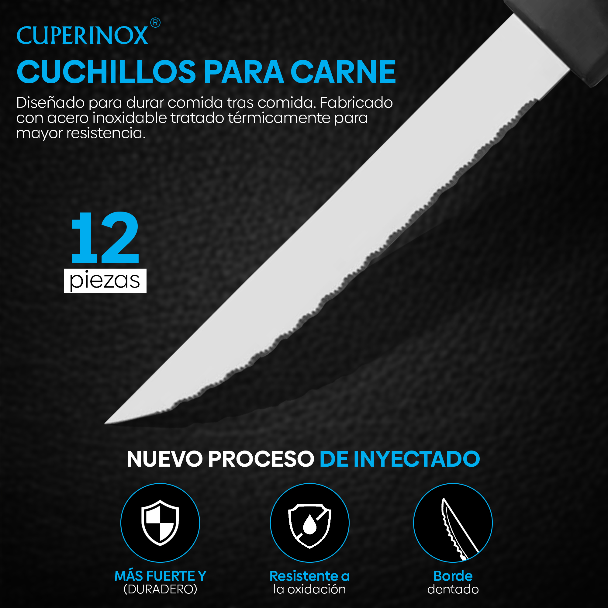 Calidad profesional, diseño robusto y un mango que marca la diferencia. El set de 12 cuchillos de mesa Cuperinox ha sido diseñado para quienes valoran la resistencia, precisión y comodidad en cada comida. Cada pieza incorpora una hoja serrada de 11 cm en acero inoxidable de alta calidad, perfecta para cortar carne, pescado o verduras sin esfuerzo. El protagonista de este set es su mango negro inyectado, fabricado con materiales técnicos de gran resistencia y alta densidad. A diferencia de los mangos convencionales, el inyectado Cuperinox ofrece un agarre ergonómico, antideslizante y duradero, incluso tras años de uso y lavados en lavavajillas. No se agrieta, no se despega y no pierde estabilidad. Pensado para el uso intensivo diario y profesional. ✔️ Apto para lavavajillas ✔️ Diseño profesional y clásico ✔️ Ideal para uso doméstico o en hostelería ✔️ Incluye estuche protector para cada cuchillo ✔️ Essential Series – calidad y funcionalidad sin concesiones Más de 60 años fabricando cuchillos de precisión. Más de 5 millones de unidades vendidas al año. Confía en la garantía Cuperinox.