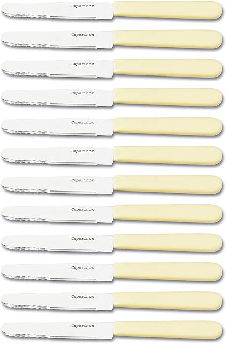 ✅ Set de 12 cuchillos de mesa en color marfil, perfectos para uso familiar o profesional.