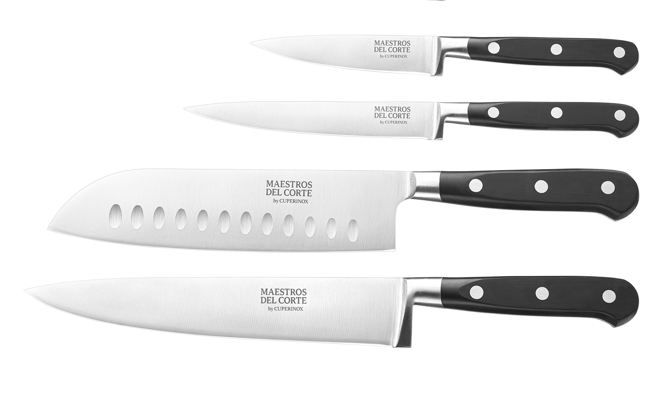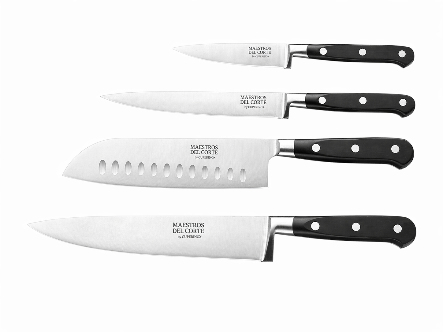 Maestros del Corte by CUPERINOX – Set de Cuchillos Profesionales de Cocina 4 Piezas | Chef 20 cm, Santoku 18 cm, Universal 13 cm y Pelador 9 cm | Acero Inoxidable de Alta Precisión | Mango Ergonómico